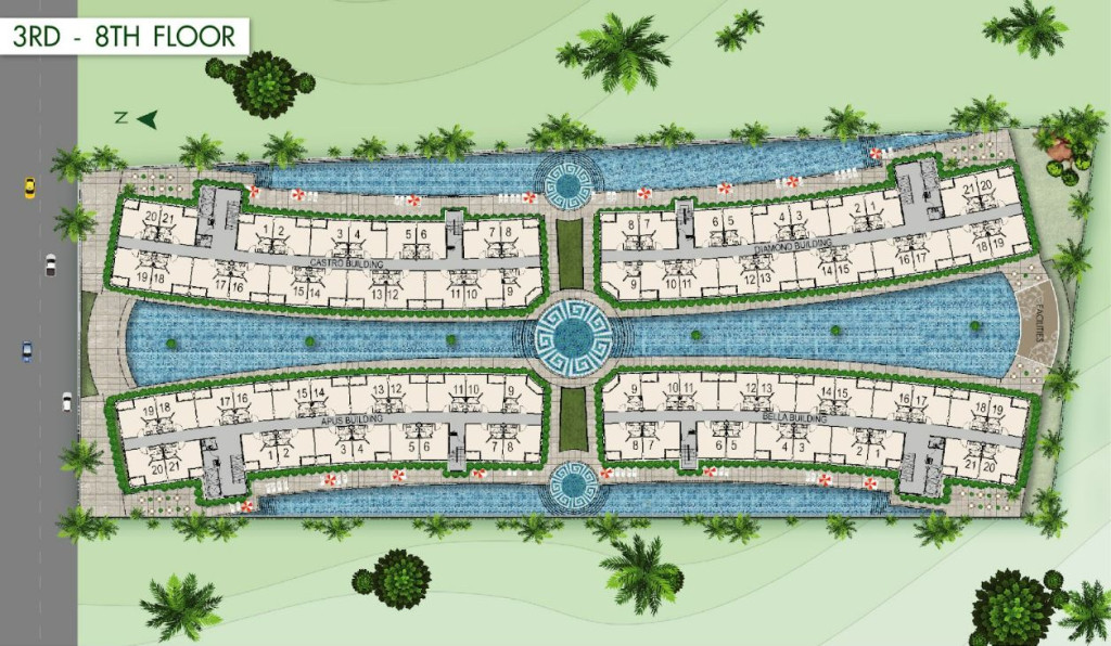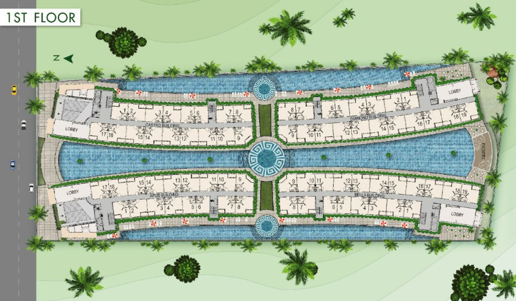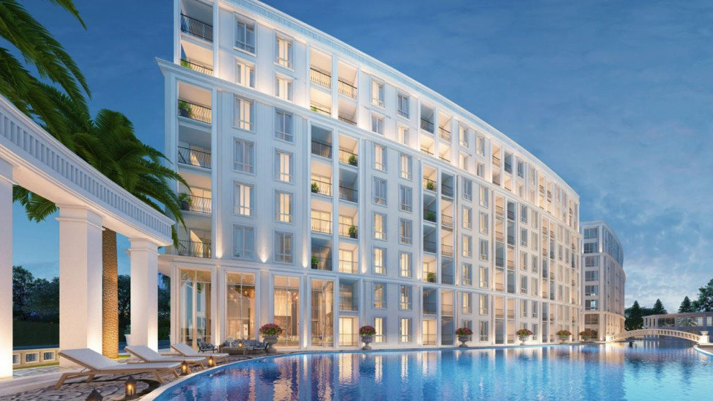 Four low-rise buildings, European-inspired architecture, warmer tones instead of glass-and-steel minimalism. It doesn’t feel like a typical city condo. More like a small resort you happen to live in.